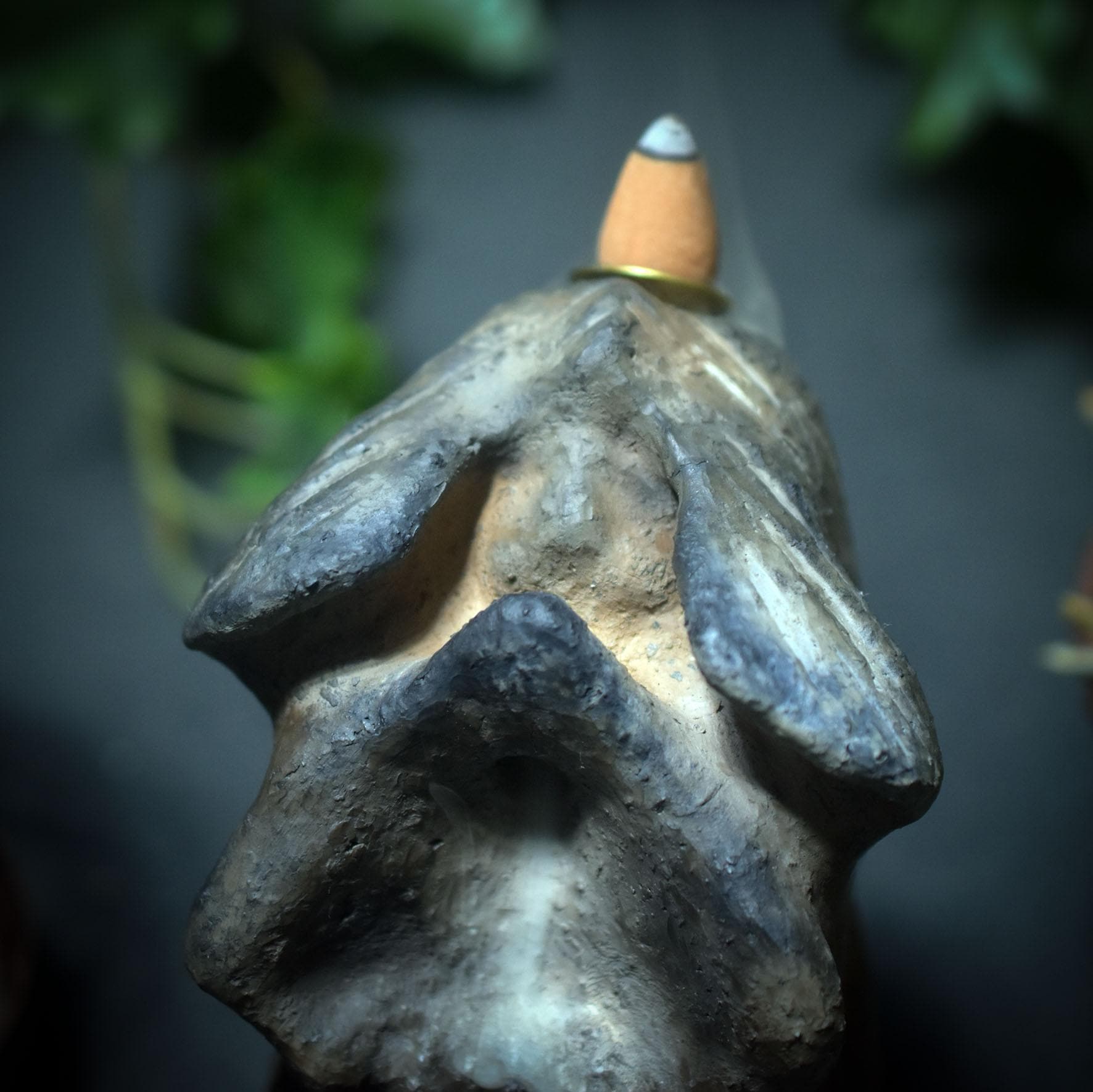 The backflow incense cone holder sits atop her hood-like headdress. As soon as you light a backflow incense cone, the smoke begins to gently waft and flows downwards in soft streams beneath her clasped hands. This creates a fascinating ritual that is not only visually impressive but also creates a meditative and calming atmosphere.
