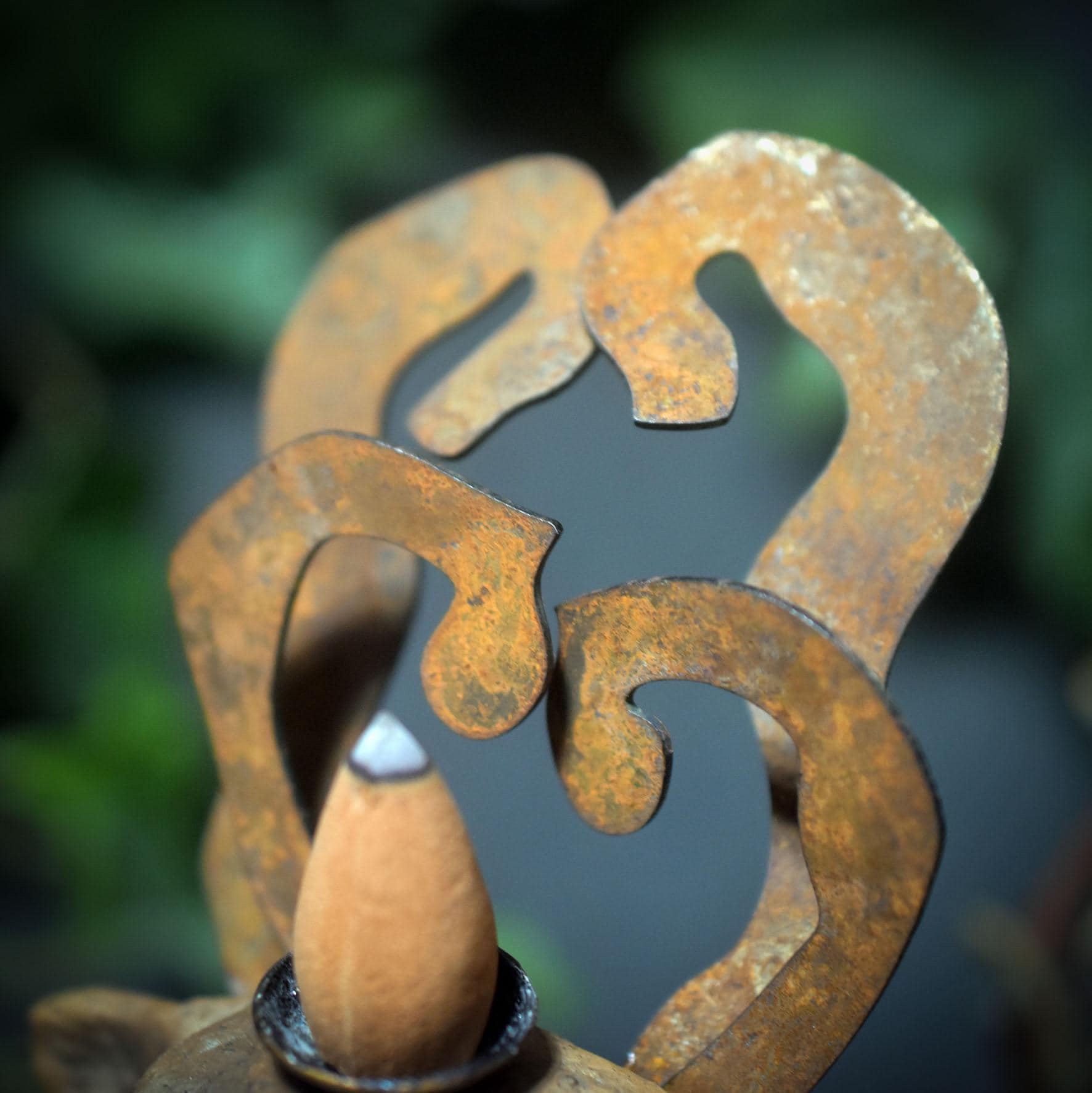 The rusted metal antlers lend the sculpture an archaic depth, combining the element of fire with the durability of metal. When you light the backflow incense cone, the smoke gently glides down the stag, enveloping it in a mystical, almost ritualistic interplay of movement and stillness.