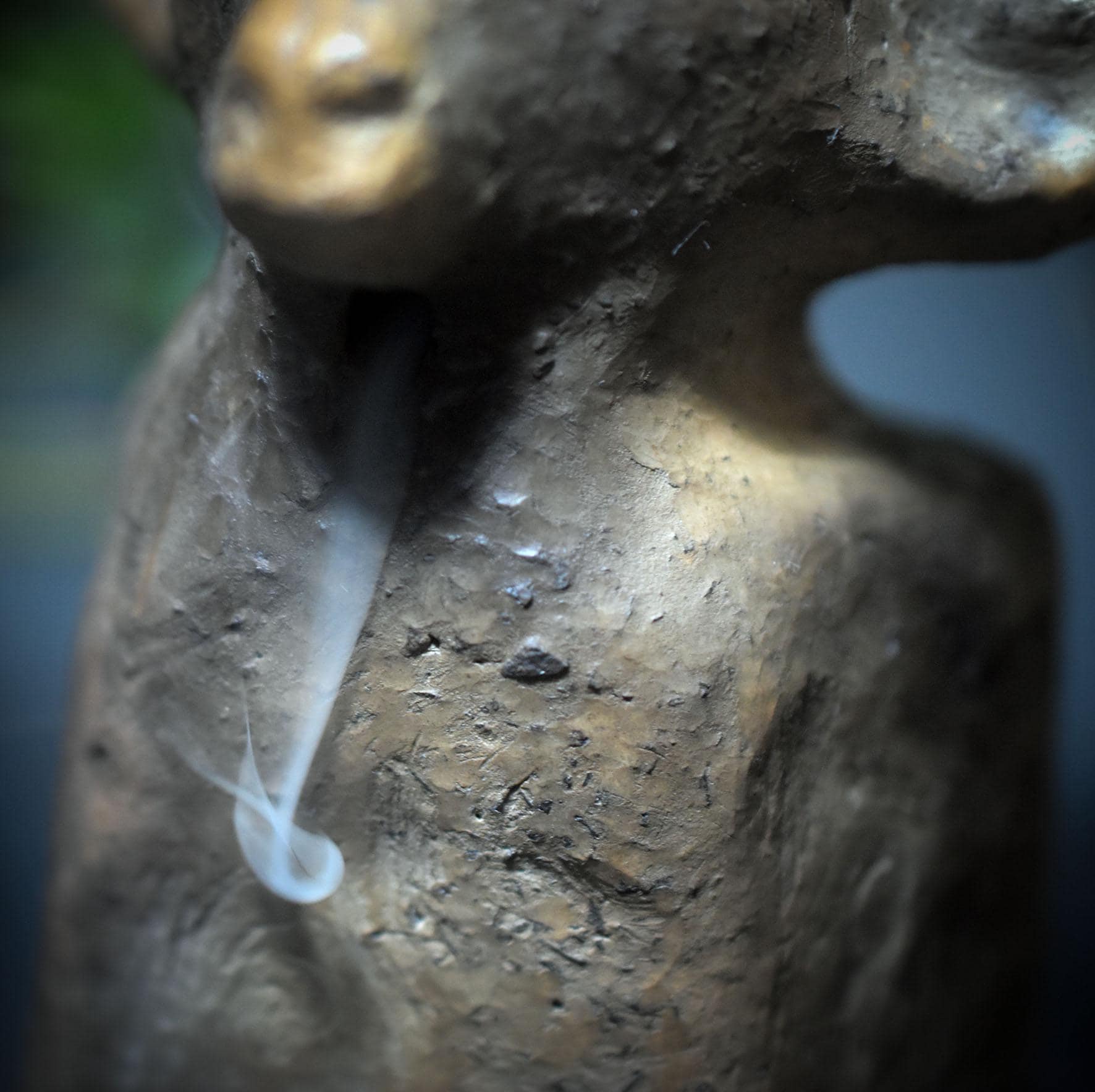 This backflow incense cone holder depicts the stag as a powerful pagan symbol of renewal, protection, and connection between the worlds. The stag's body was crafted using traditional smoke-fire techniques—each piece bears the traces of fire and tells its own story of earth, smoke, and transformation.