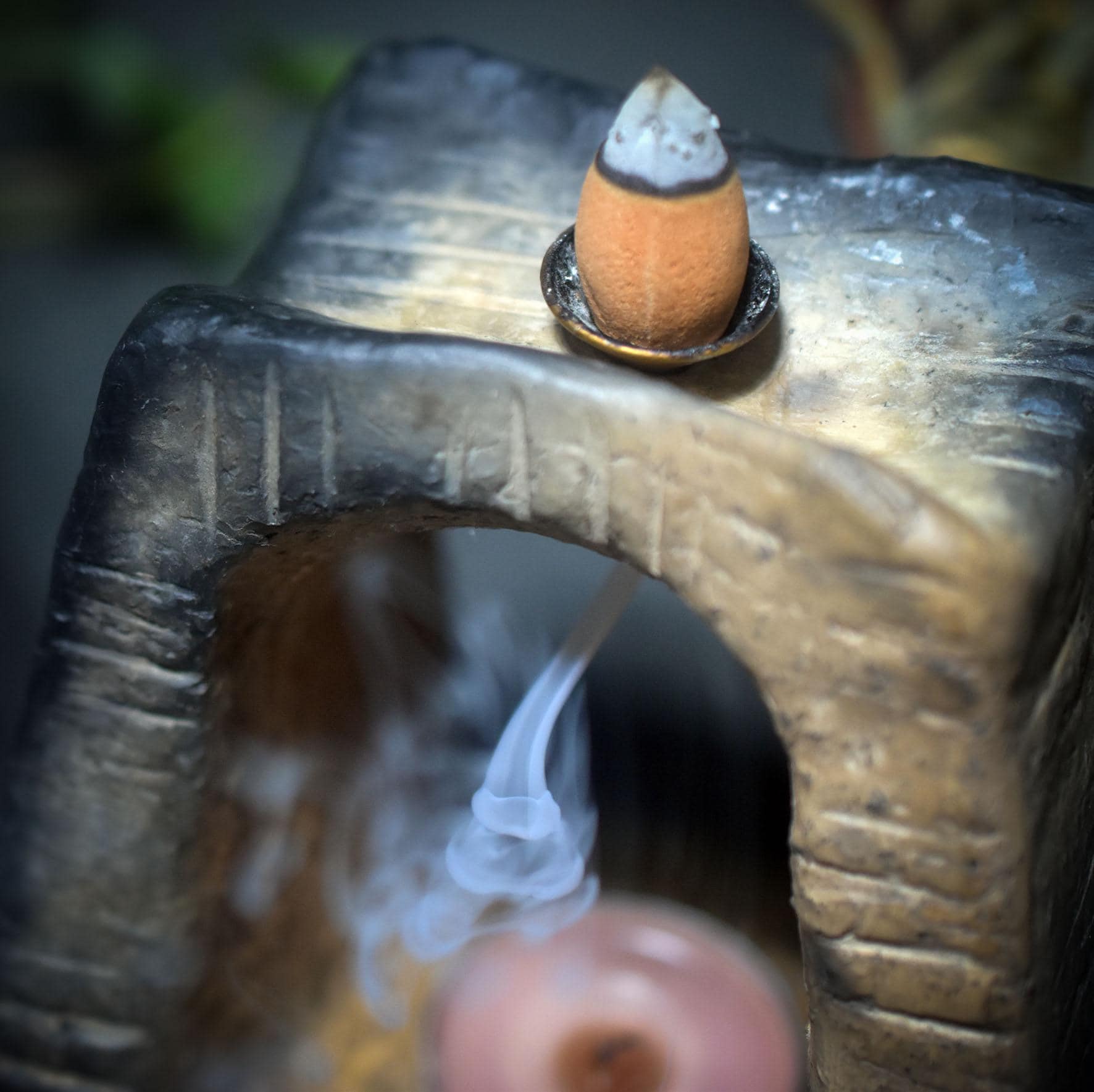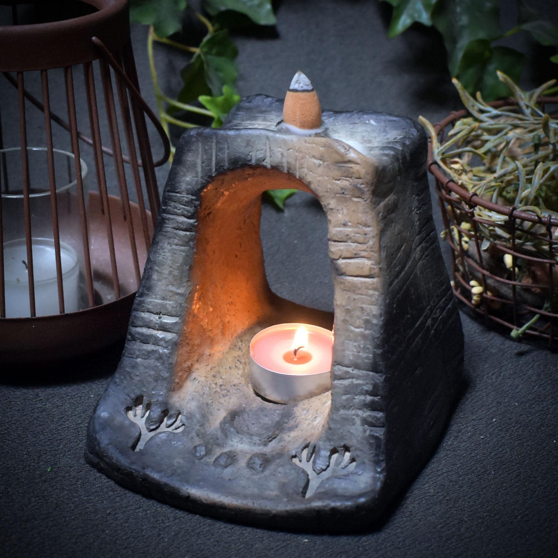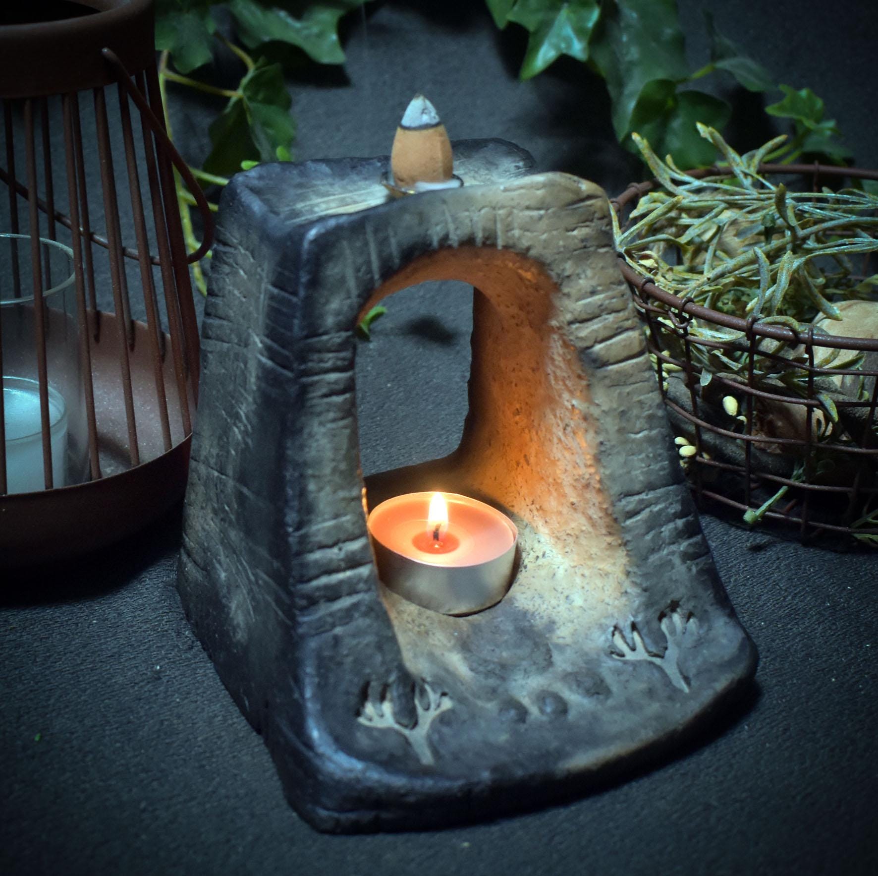 The inlaid relief of a deer's antler and the Wiccan blessing symbol reminds you of the power of blessing, of transformation, and of the deep connection to nature. When you light the backflow incense cone, the smoke gently drifts down through the archway, filling the room with calm energy and symbolically opening the path to inner clarity.