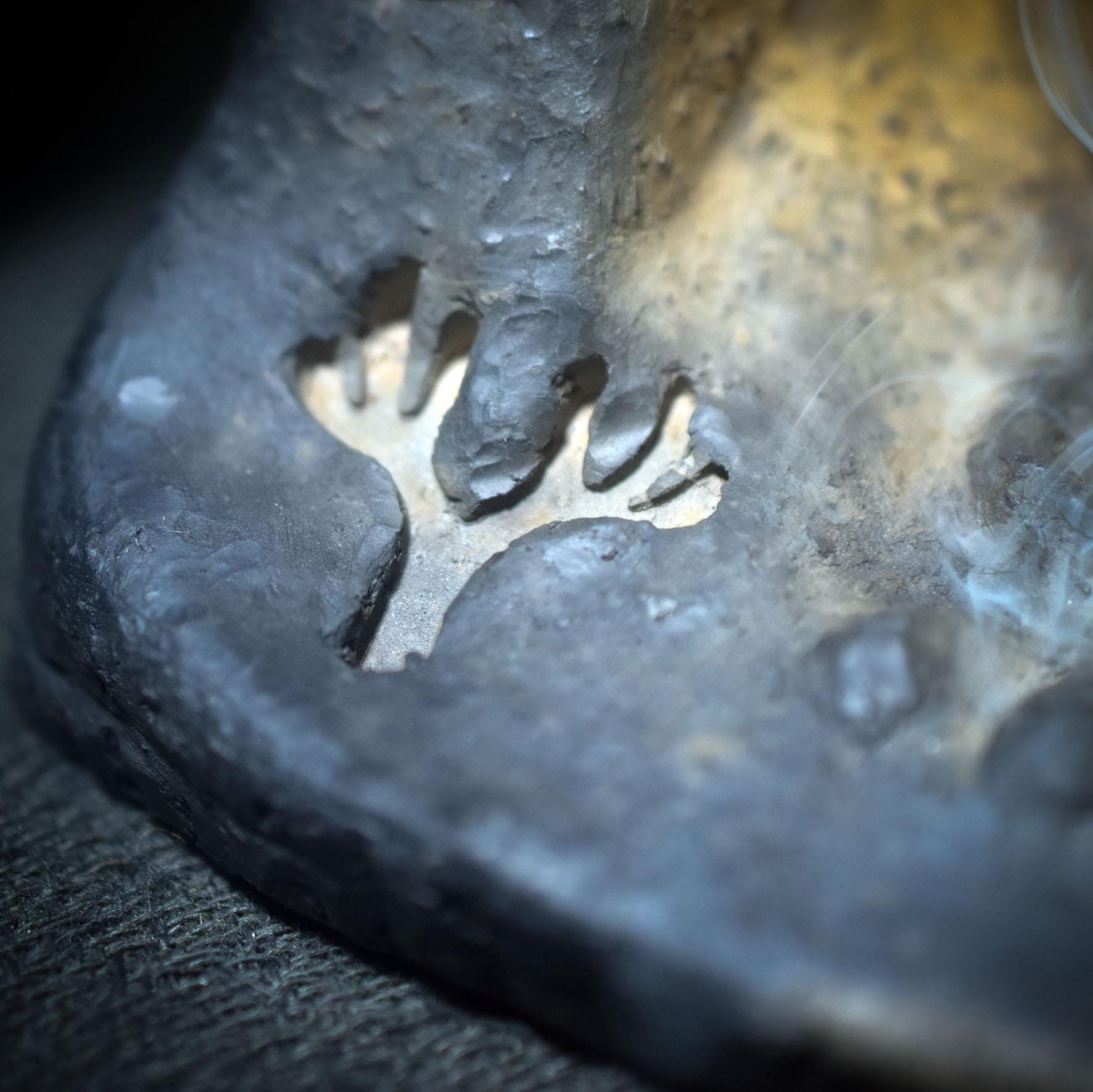 This work, crafted using traditional smoke-fire techniques, is called "Gate of Transition." It combines the ancient symbolism of fire, earth, and smoke in a powerful form—an archway or tower that symbolizes the transition between worlds.