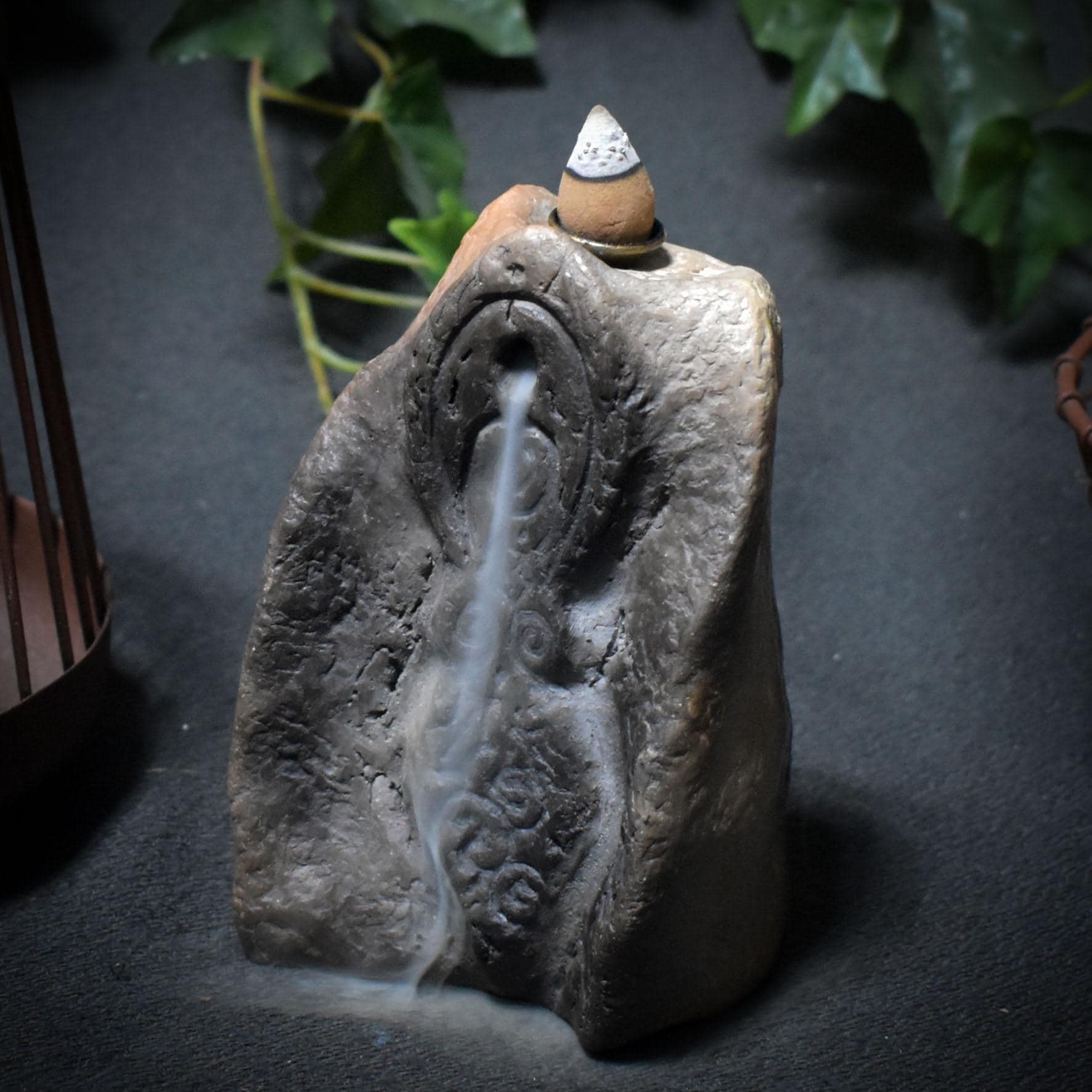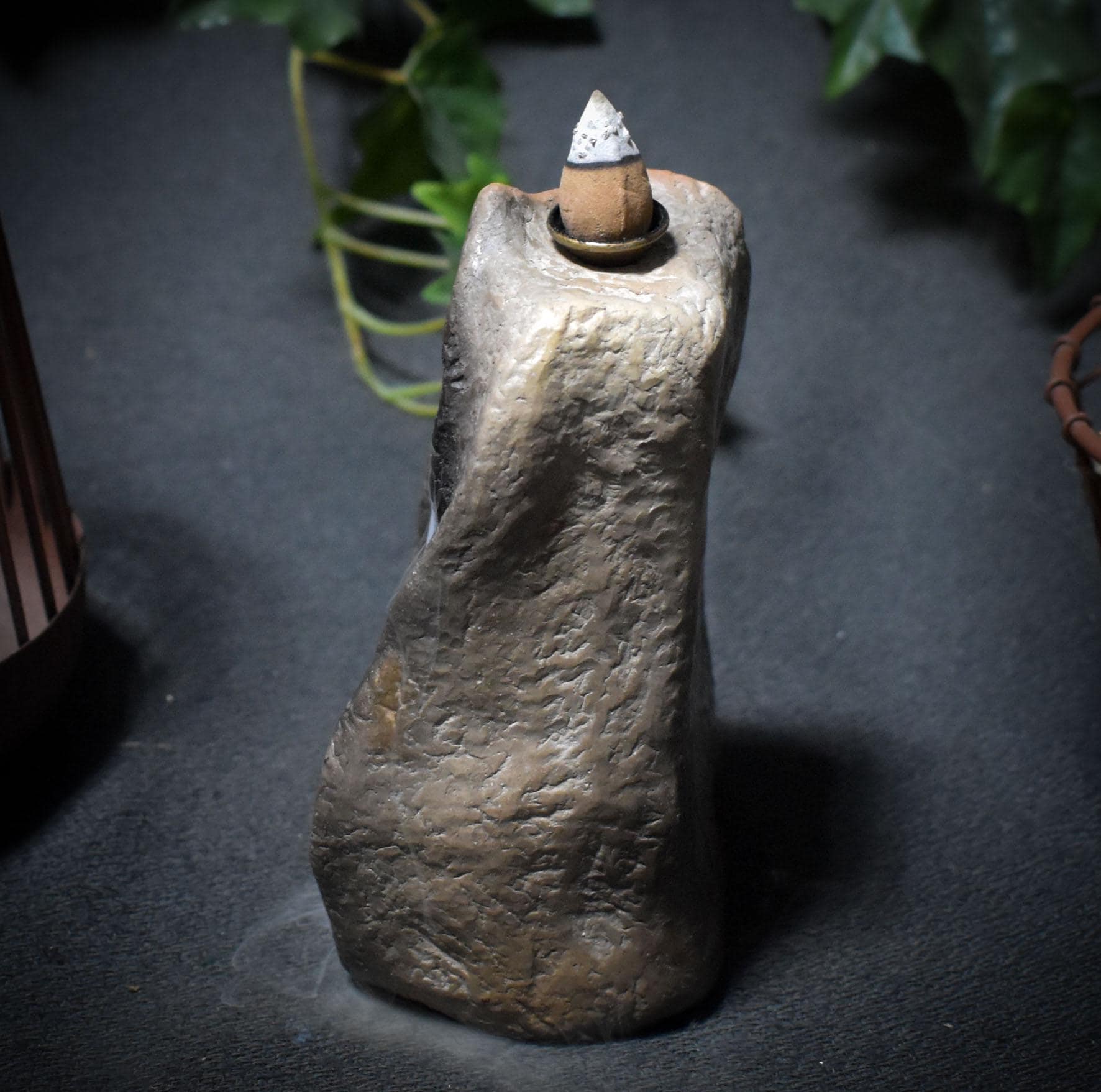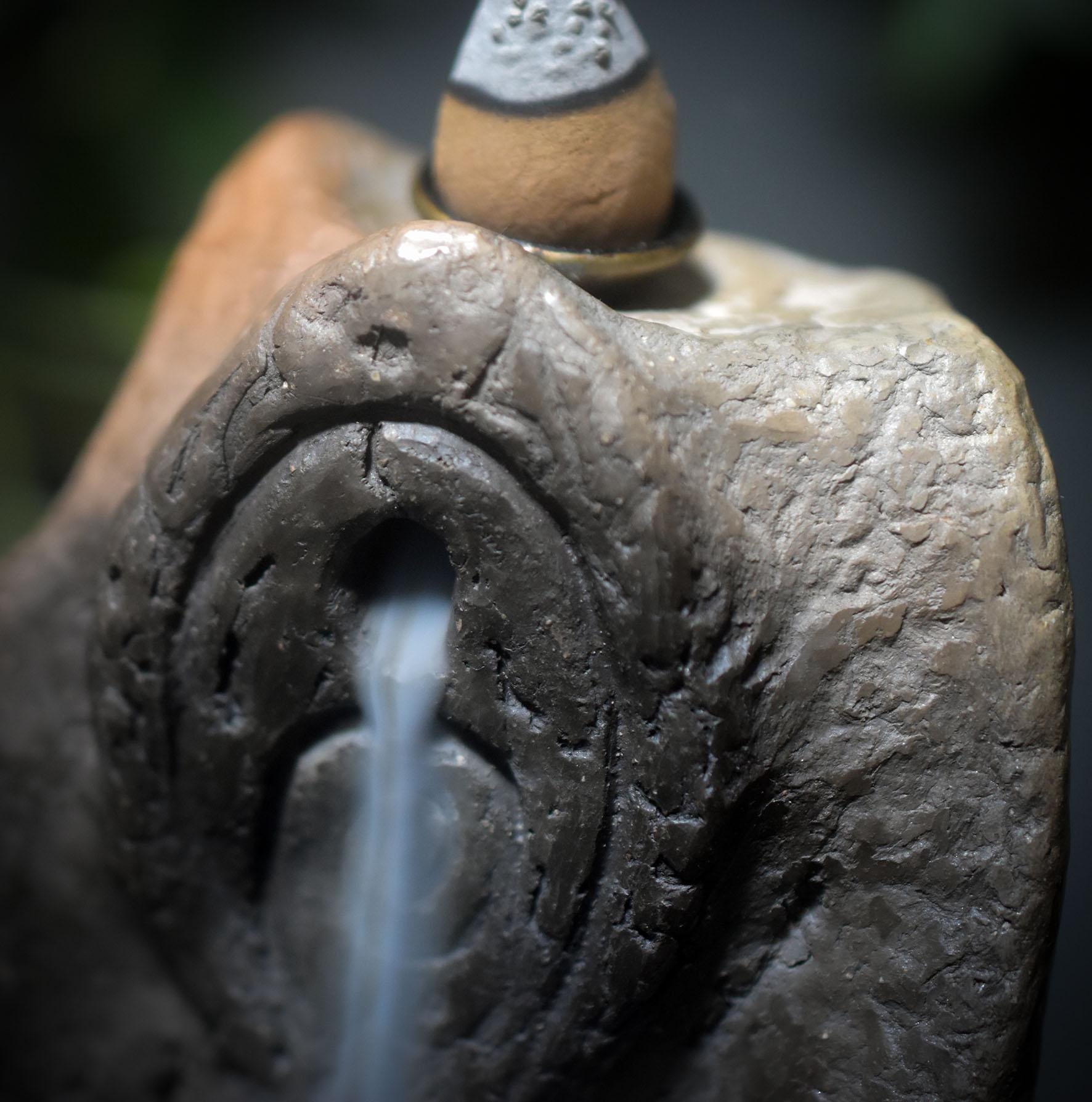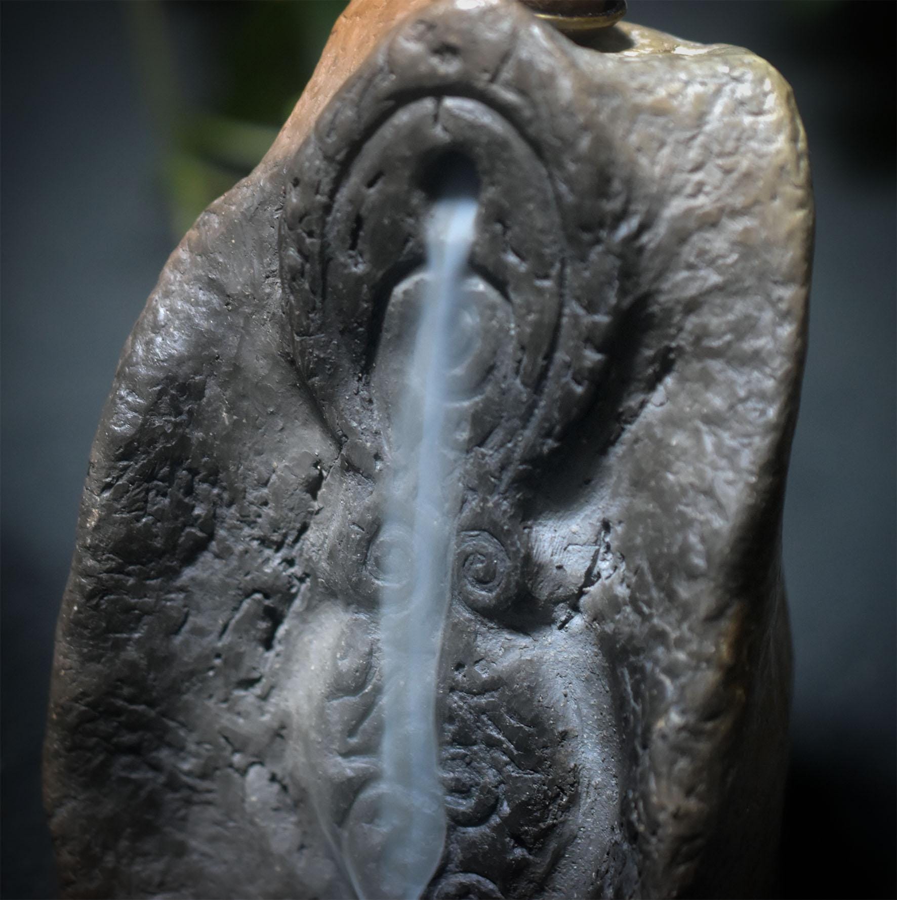 The backflow incense cone holder sits atop its artfully crafted form. When you light a cone, the smoke gently flows down and envelops the figure like a living veil. This creates a fascinating ritual that bestows peace, strength, and reflection—especially during the Yule and Twelve Nights.