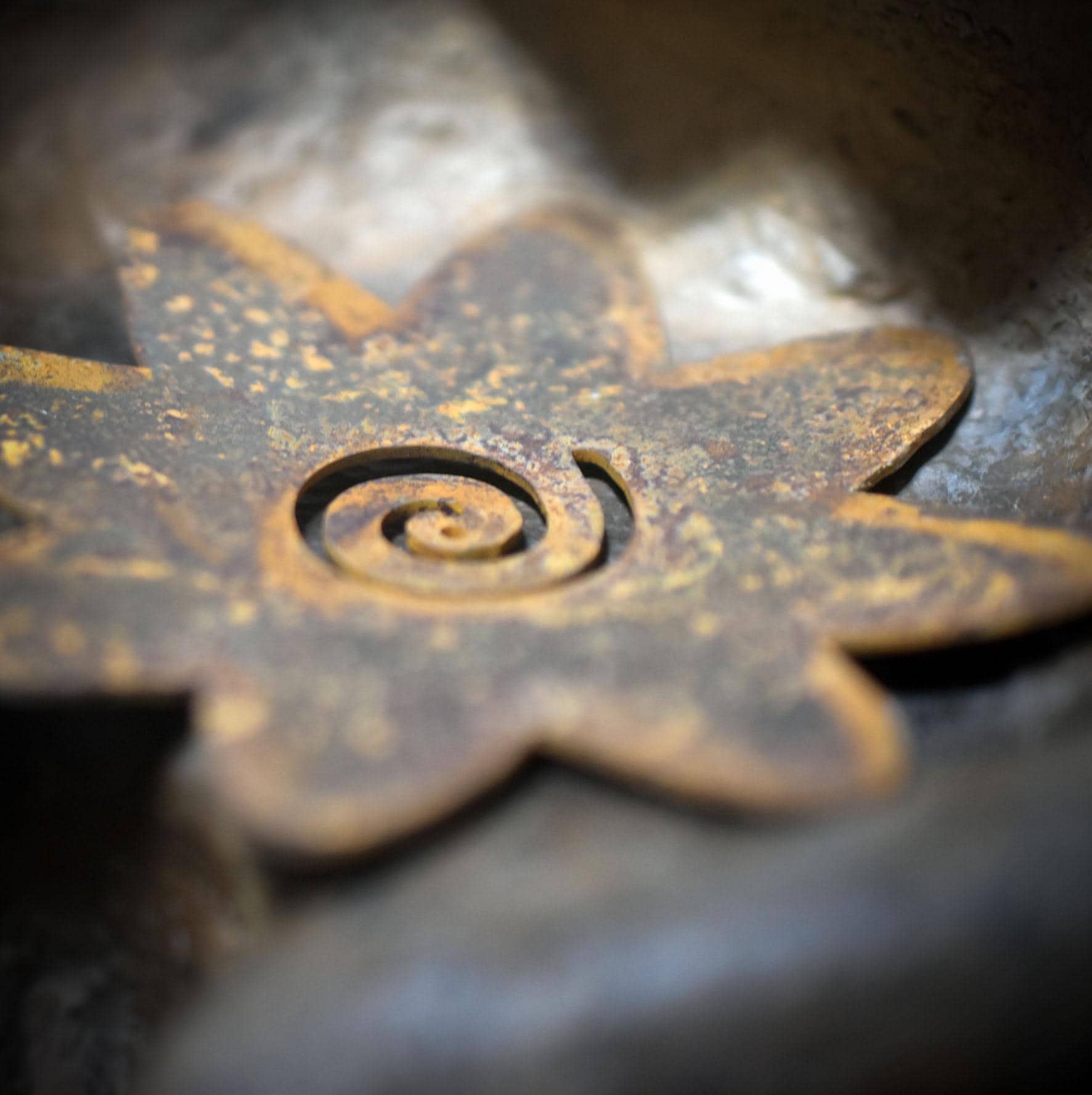Resting in its abdominal cavity is a flower made of rusty metal, at the center of which forms a spiral of life. It represents the constant growth, growth, and decay—the eternal cycle of life.