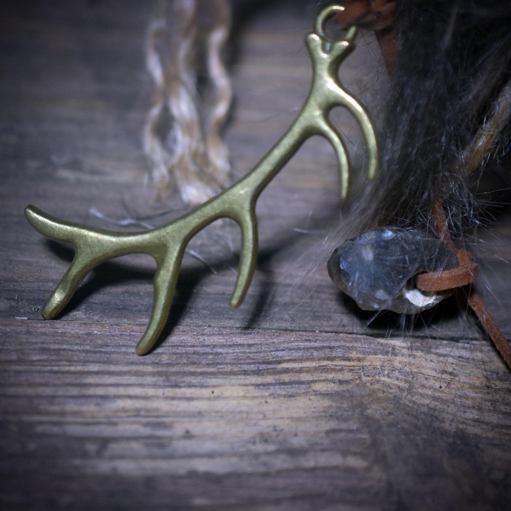 Handmade on a wooden stick, with wool, obsidian, metal antler & bear claw