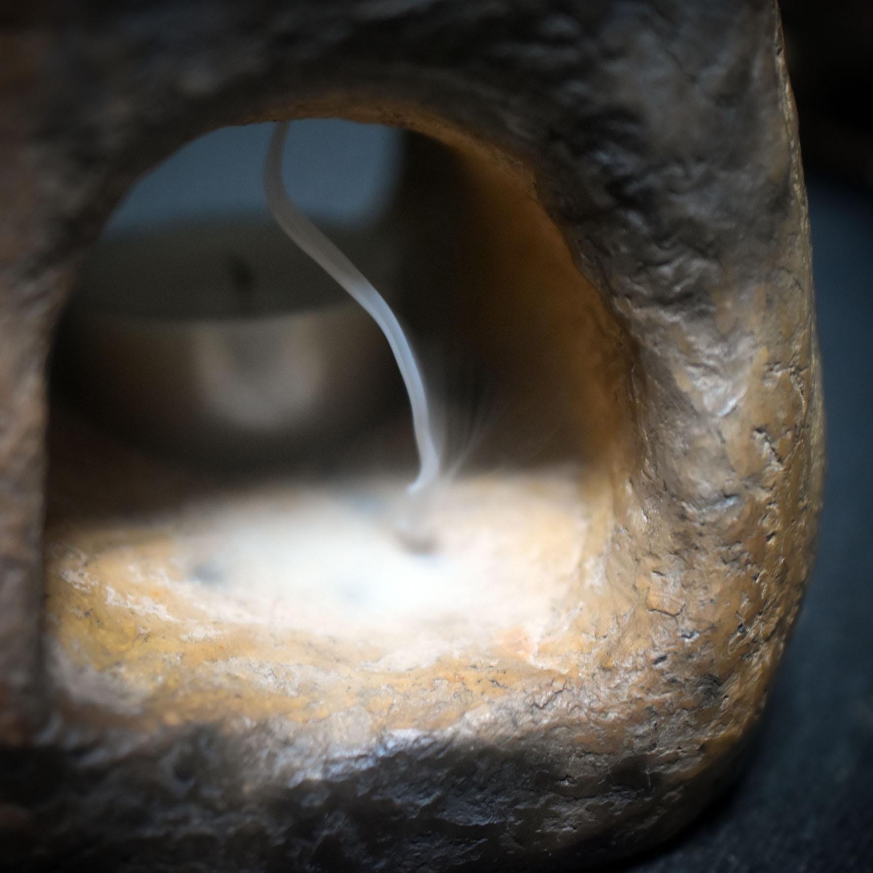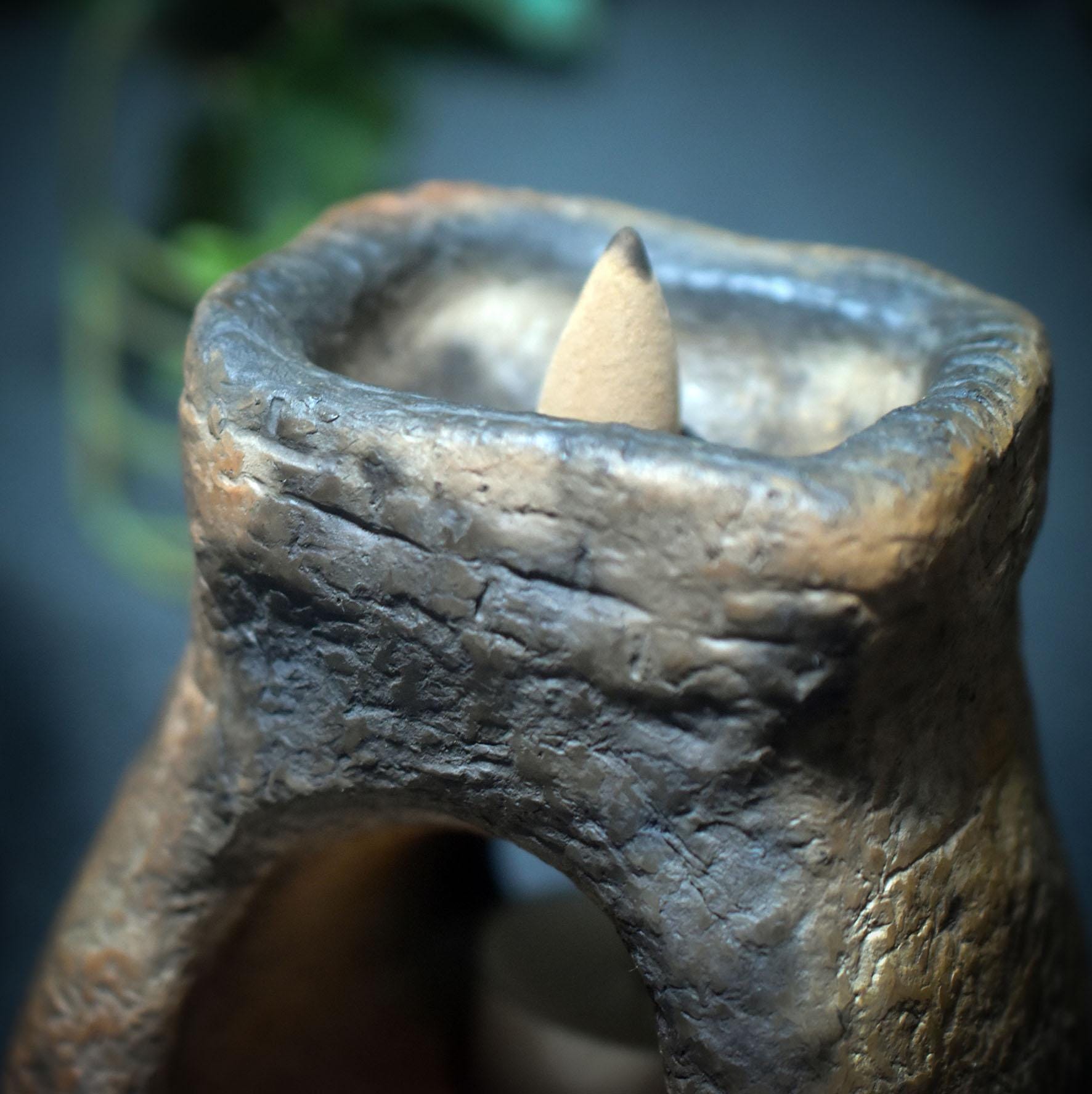This backflow incense cone holder combines fire, smoke, and earth into an archaic ritual object.