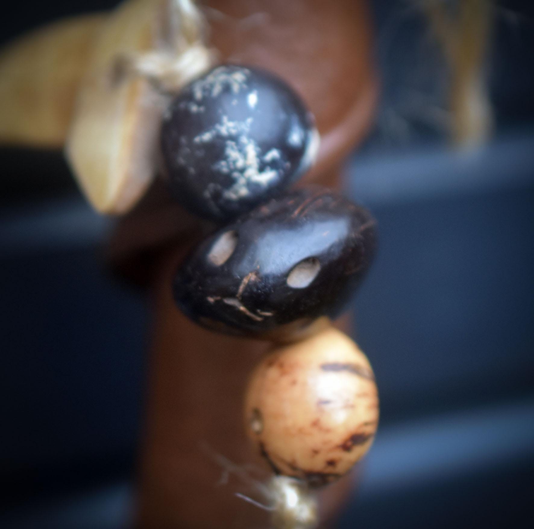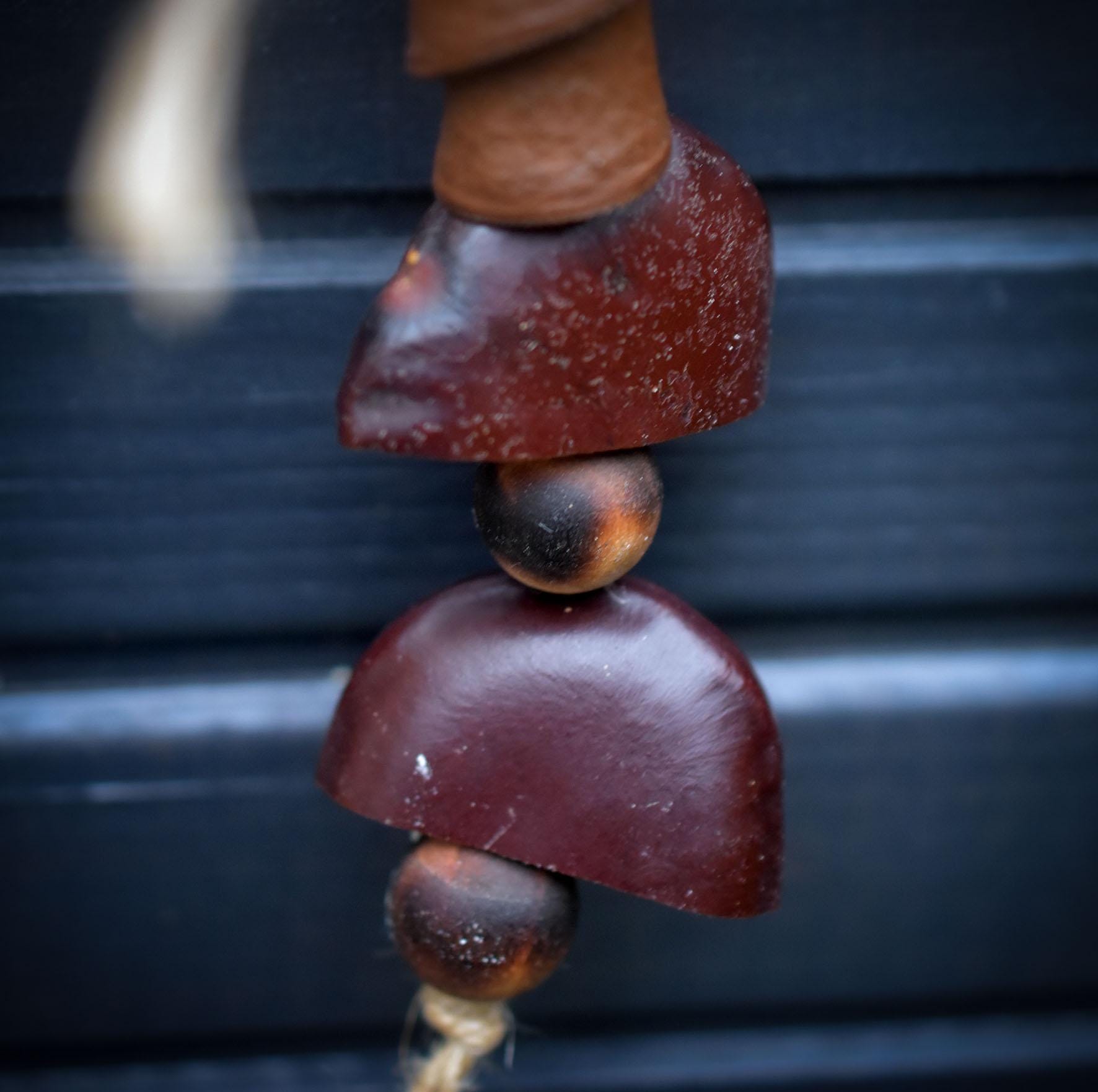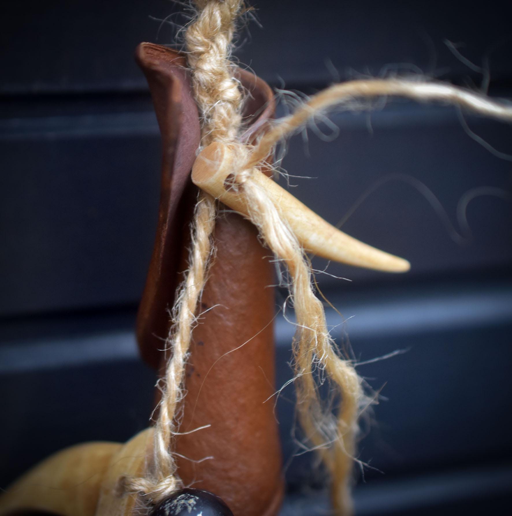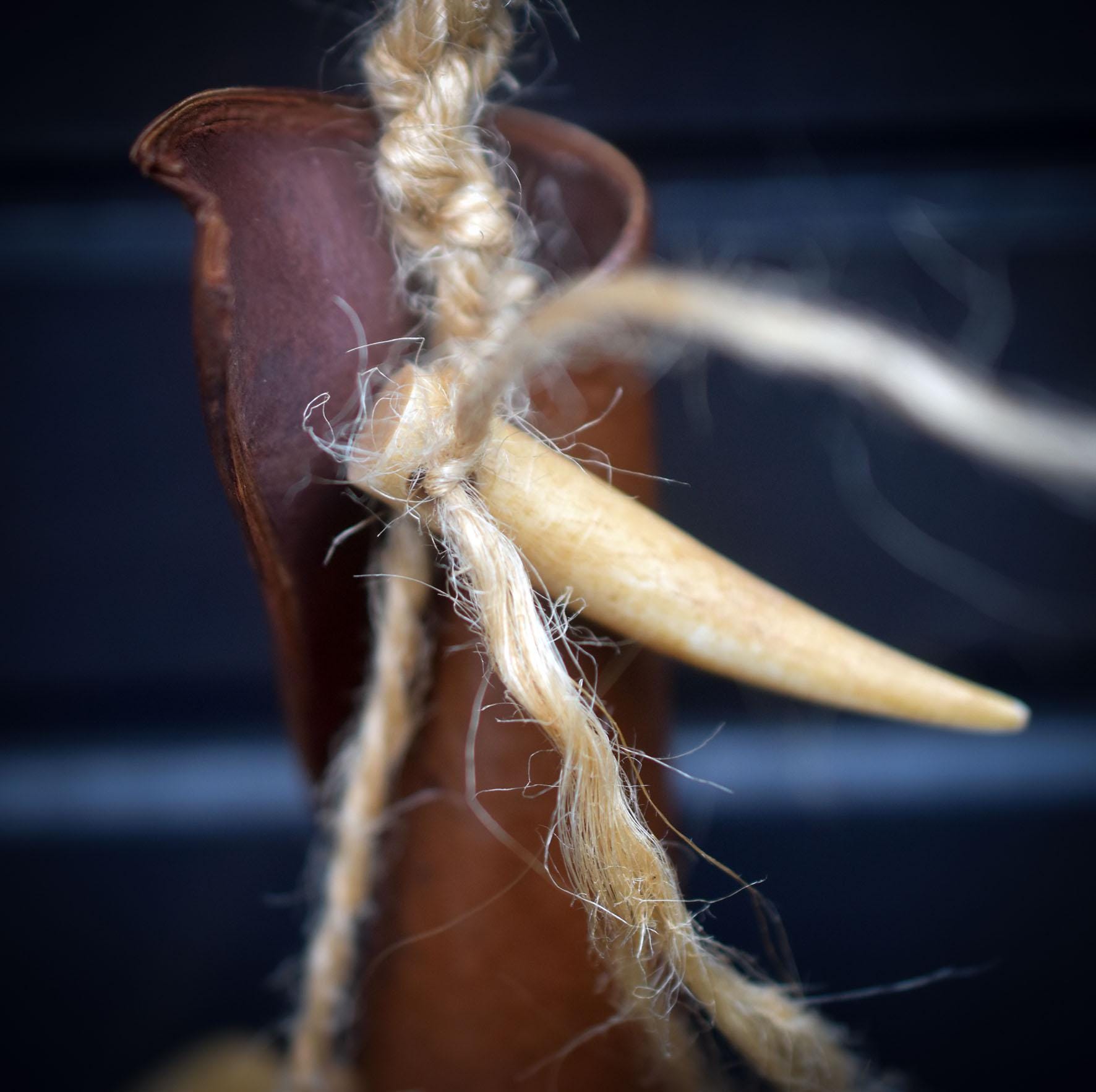 It is decorated with a tusk and a bear's claw made of camel bone, Bodhi beads, wooden beads and seed husks, carefully strung on jute.