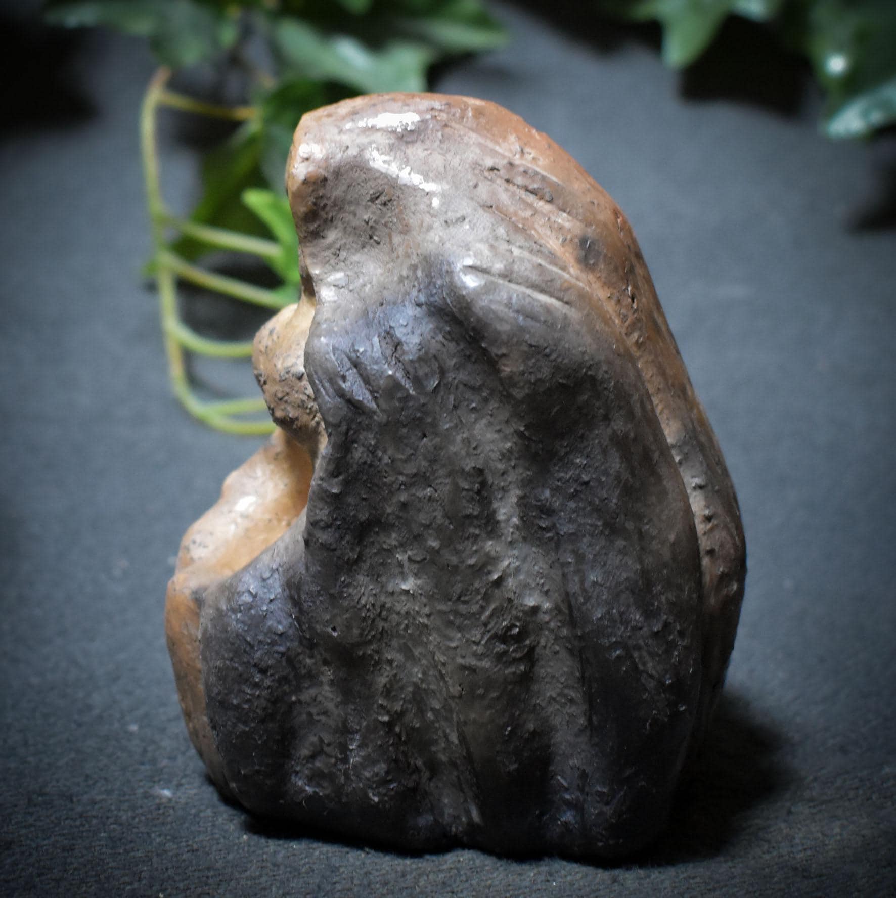 Handcrafted goddess with bowl in traditional smoke-firing art – spiritual ritual figure