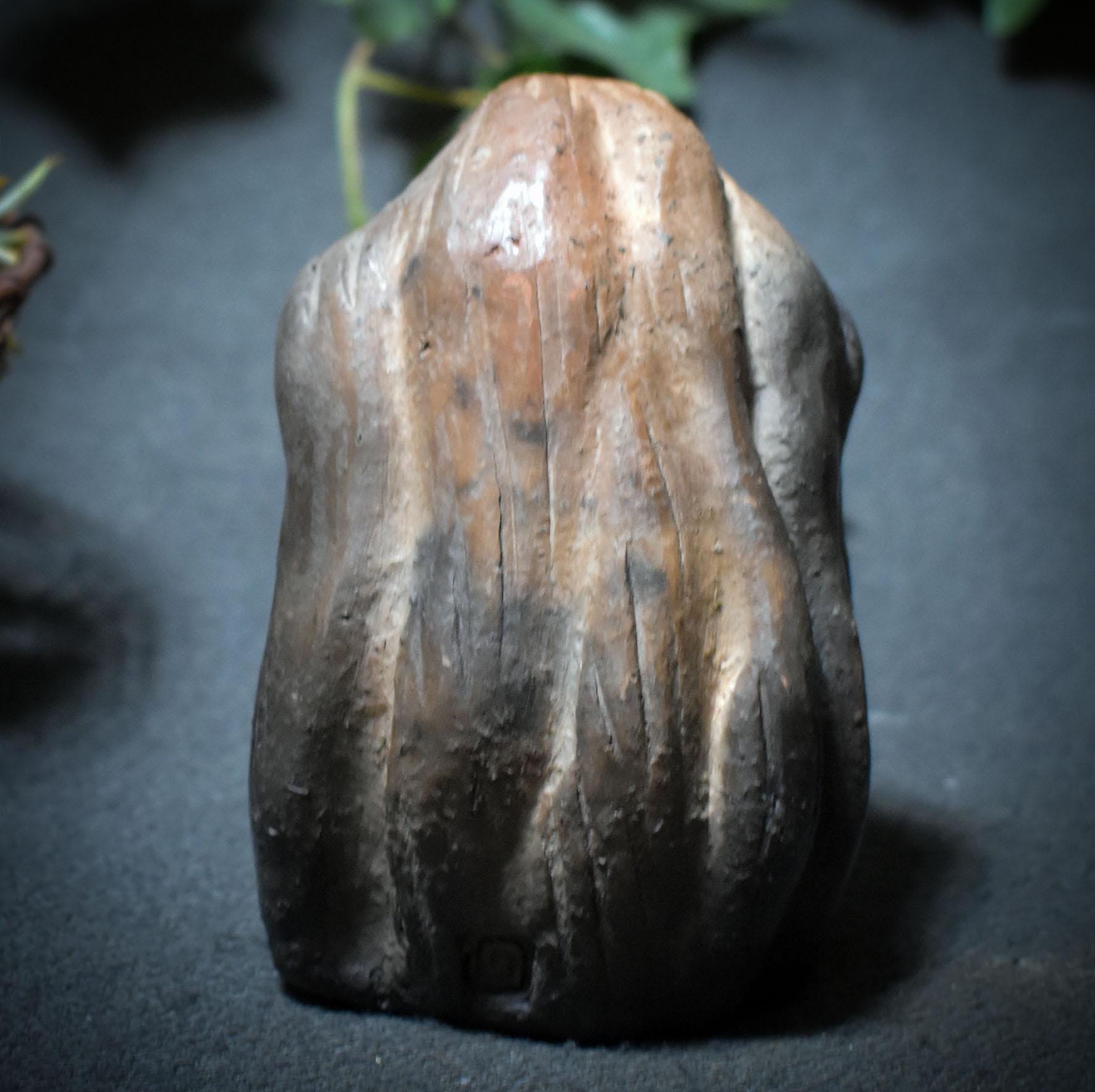 This handcrafted sculpture of a goddess with a suggested bowl before her body was created using traditional smoke-firing techniques – an ancient method in which fire, earth, and smoke work harmoniously together. The resulting patterns, lines, and shading are unique and give each figure its own soul.